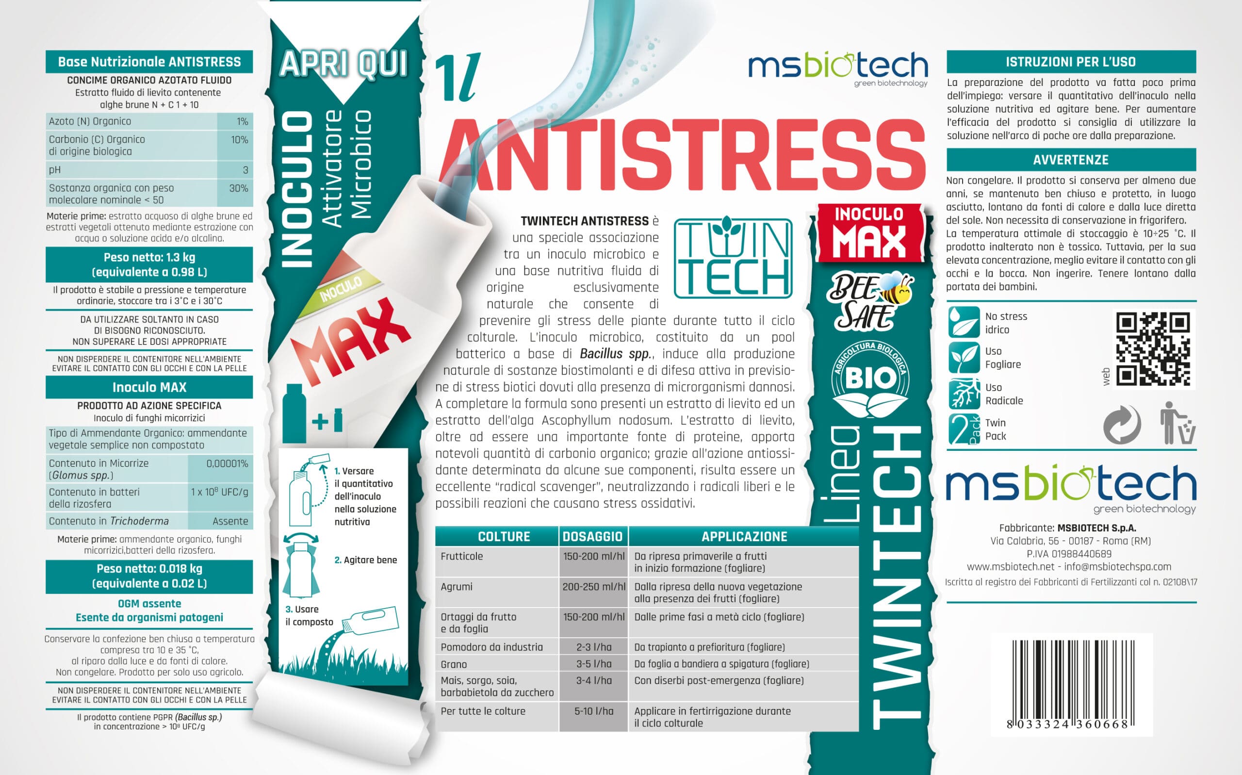 TWINTECH ANTI-STRESS is a special association between a microbial inoculum and a fluid nutritive base of exclusively natural origin that prevents plant stress during the entire cultivation cycle.