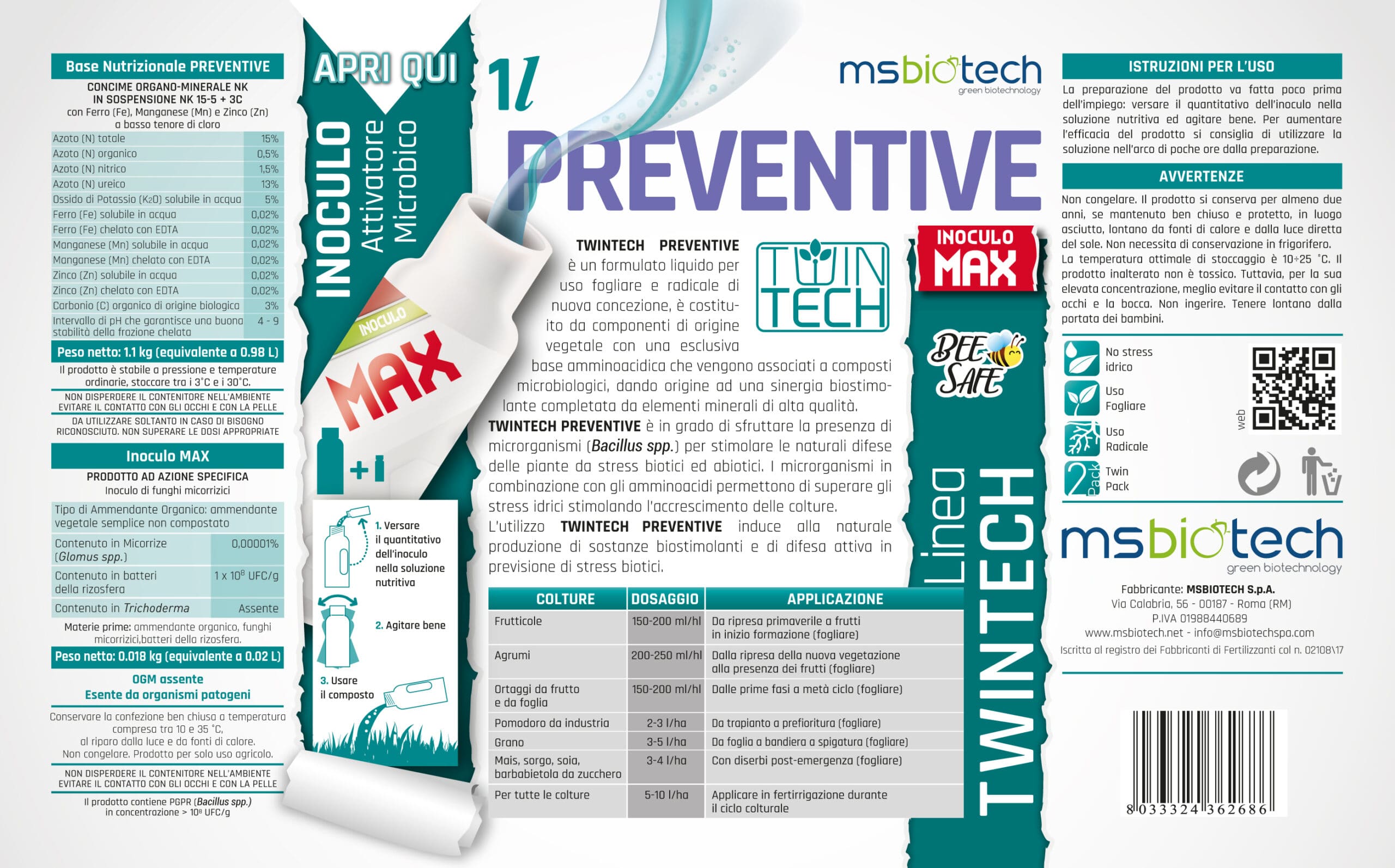PREVENTIVE TWINTECH is a liquid formulation for foliar and radical use of new conception, it consists of components of vegetable origin with an exclusive amino acid base that are associated with microbiological compounds, giving rise to a biostimulant synergy completed by high quality mineral elements.