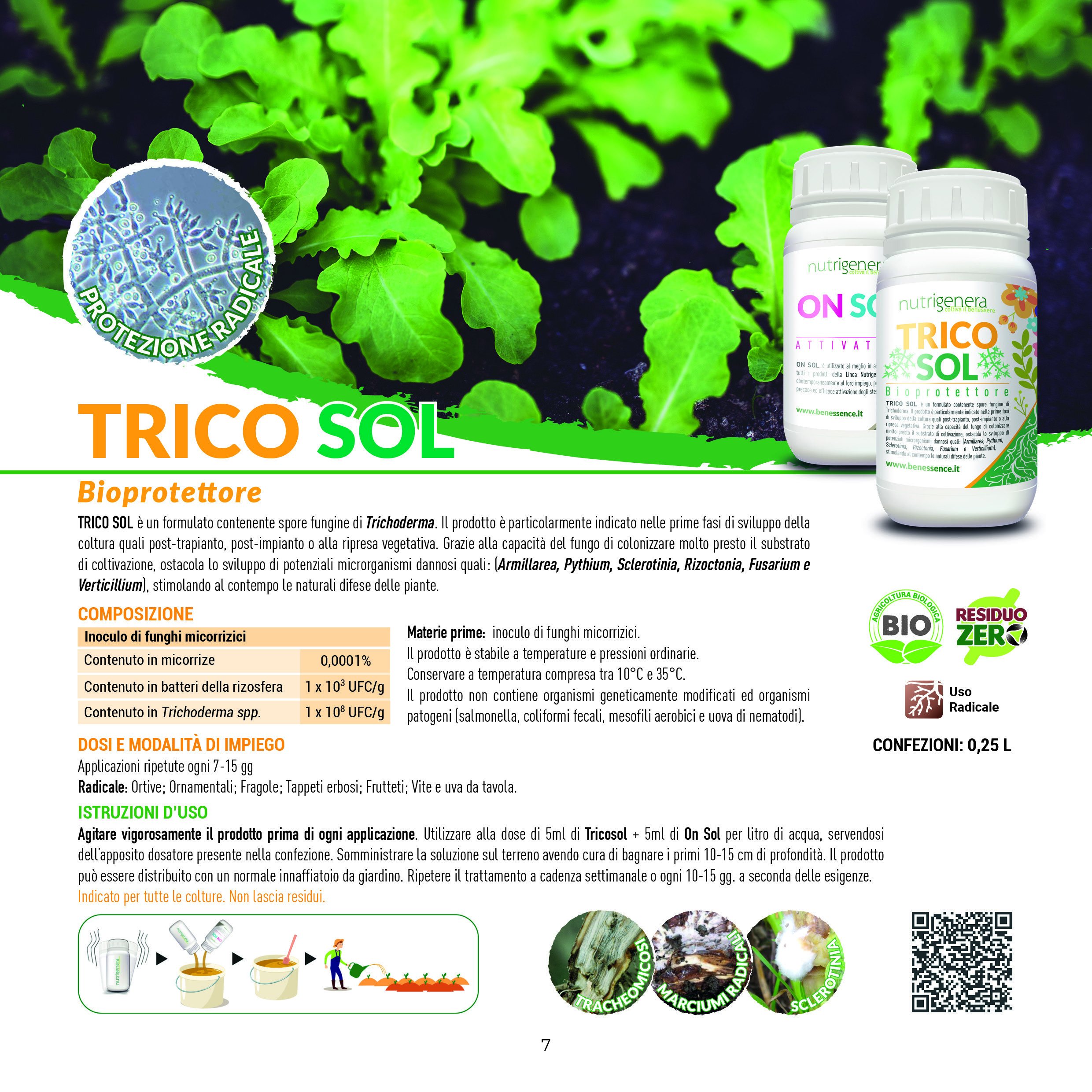 Trico sol è un formulato contenente spore fungine di Trichoderma e batteri della rizosfera, funge da bioprotettore radicale. Il prodotto è particolarmente indicato nelle prime fasi di sviluppo della coltura quali post trapianto, post impianto o alla ripresa vegetativa. Grazie alla capacità del fungo di colonizzare molto presto il substrato di coltivazione , ostacola lo sviluppo di potenziali microrganismi dannosi (quali: Armillarea, Phytium, Sclerotinia, Rizoctonia, Fusarium e Verticillium), stimolando al contempo le naturali difese delle piante.